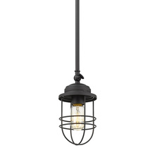 Bring coastal elegance into your home with the Golden Lighting Seaport 1-light Pendant in Matte Black. Featuring a metal shade and a matte black frame, it creates a welcoming atmosphere. The metal shade provides a classic cage design, enhancing the lighting experience with a touch of nautical inspiration. The matte black finish reflects the epitome of modern style, with a smooth surface that absorbs light, instilling a sophisticated yet relaxed aesthetic in your interiors. This versatile fixture fits seamlessly in any decor, from minimalist to industrial. Perfect for kitchens, dining rooms, and entryways, this pendant light is damp location rated for areas with occasional moisture. It features a convertible design for adjustable height installation, making it adaptable for various ceiling types. This fixture requires 1 E26 medium base bulb (not included) with a maximum wattage of 60. Overall Dimensions: 4.63"W x 9.25"H x 4.63"D. Elevate your lighting with a fixture that perfectly combines function and beauty in any setting.
