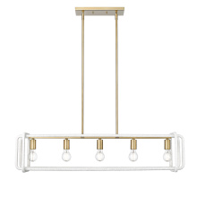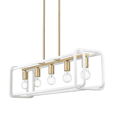Bring coastal elegance into your home with the Wry Lighting Camden 5-light Island Light. Featuring a brushed champagne brass frame, it creates a welcoming atmosphere fitting for any modern space. The fixture is crafted with handwoven raphia rope, adding a unique texture that evokes a breezy, relaxed feel. This artisanal material enhances the aesthetic while providing a warm glow. Its brushed champagne brass finish offers an understated and elegant alternative to traditional gold, seamlessly blending warmth and sophistication. Tailored for kitchen islands, this lighting fixture is damp location rated, making it ideal for covered and semi-enclosed spaces. It is also sloped-ceiling compatible and adjustable in height, accommodating various ceiling types. Overall dimensions measure 41.13"W x 9.75"H x 8.75"D, and it requires 5 E26 medium base bulbs (not included), with a maximum wattage of 60 per bulb. Elevate your culinary space with this charming piece, a true embodiment of quality and style.