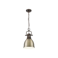 Bring farmhouse elegance into your home with the Yep by Golden Lighting Duncan 1-light 9in Chain Hung Pendant. Featuring a metal shade and a Rubbed Bronze frame, it creates a welcoming atmosphere. The pendant's metal shade showcases an Aged Brass finish that embodies timeless elegance, with a warm, antiqued gold base and a finely brushed texture that enhances the light effect. A go-to finish for many, the Rubbed Bronze brings depth and warmth, perfectly complementing various styles from traditional to transitional. Ideal for kitchens, dining rooms, or bedrooms, this damp location-rated fixture is suitable for covered spaces. Install it effortlessly on sloped ceilings, and adjust the hanging length between 19.5" to 91.5". Overall Dimensions: 8.88"W x 16.5"H x 8.88"D, Requires 1 E26 Medium base bulbs (not included), with a maximum wattage of 100. Elevate your space and enjoy the quality craftsmanship of the Yep by Golden Lighting.