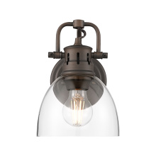 Bring farmhouse elegance into your home with the Yep by Golden Lighting Duncan 1-light Vanity. Featuring a glass shade and a Rubbed Bronze frame, it creates a welcoming atmosphere. The clear glass shade offers unobstructed light and a polished look, showcasing the bulb beautifully to create warm, inviting illumination. This versatile detail complements various styles, enhancing the charm of any space. With its Rubbed Bronze finish, this vanity light radiates warmth and sophistication, making it suitable for modern farmhouse, transitional, or industrial decors. Brighten up bathrooms with dedicated lighting that flatters while providing practical task illumination. It is Damp Location Rated, suitable for covered and semi-enclosed spaces like bathrooms and laundry rooms. The adjustable directional heads can pivot, allowing customized lighting to highlight specific areas. Overall Dimensions: 6.5"W x 8.5"H x 8.25"D, requiring 1 E26 Medium base bulb (not included), with a maximum wattage of 100. This fixture not only enhances visibility but also makes a stylish statement in your interior design.