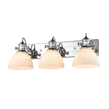 Bring traditional elegance into your home with the Yep by Golden Lighting Hines 3-light Vanity in Chrome and Opal Glass. Featuring an opal glass shade and a polished chrome frame, it creates a welcoming atmosphere. The opal glass shade provides a beautiful, luminous glow, designed to diffuse light evenly for a soft, glare-free experience. Timeless and elegant, its milky white color enhances the overall charm. Our polished chrome finish is both sleek and sophisticated, offering a mirror-like surface that complements various decor styles from ultra-modern to classic traditional. Suitable for damp locations, this fixture is perfect for bathrooms, covered porches, and laundry rooms. The adjustable directional heads allow you to customize the lighting to highlight specific areas or objects. Overall dimensions are 25.13"W x 8.75"H x 8.25"D, and it requires 3 E26 Medium base bulbs (not included), with a maximum wattage of 60 per bulb. Enhance your bathroom's sophistication with this stunning fixture, crafted from quality materials for lasting beauty.