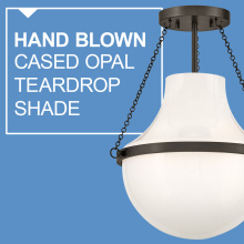 Fusing a sculpted, modern form with classically styled details, Collins features a transitional teardrop shade crafted from blown, cased opal glass. A central metal band and delicate chain uprights are available in Heritage Brass or Black Oxide finishes.