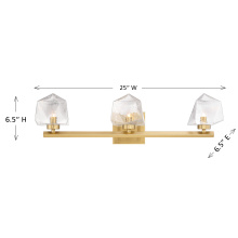 The Castello 3-light bath light from Savoy House is cool as ice! Its sharply cut shades of clear hammered glass add a bright touch of geometry and texture, pairing perfectly with the thick arm and backplate that is finished in Warm Brass. Castello is 6.5" in height, 25" in width and extends 6.5" from the wall. Uses three LED G9 bulbs. Bulbs not included.