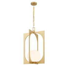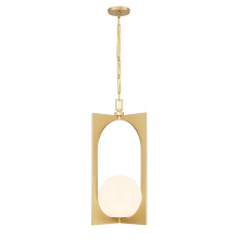 Get geometric elegance like no other when you get the Savoy House Harding 1-light pendant. An orb of opal glass is held within a sleekly structured frame that expertly combines ovals with rectangles. The shape of the frame is reflected in the hanging chain, too! A Spun Gold finish adds shimmer and shine. Harding is 28" in height and 16.5" in width. It uses one standard size bulb of up to 60 watts. Bulb not included. Comes with 120" of chain and 144" of cord.