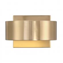 The Savoy House Talamanca 1-light sconce is part of Moderne by Breegan Jane, bringing her signature approachable modern luxury style to your home. Breegan loves the timeless and elevating beauty of brass, as seen in this chic and sleek design. An integrated LED light source is held inside a round structure mounted to a square backplate, creating a clean look that is perfect for adding a pop of light in any spot. Finished in champagne-toned Noble Brass. Talamanca is 4.75" in height, 8" in width and extends 8.25" from the wall. Damp area rated.